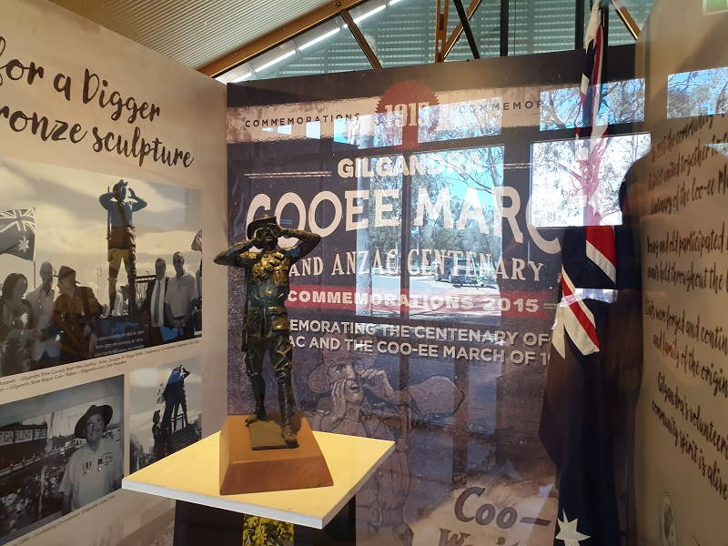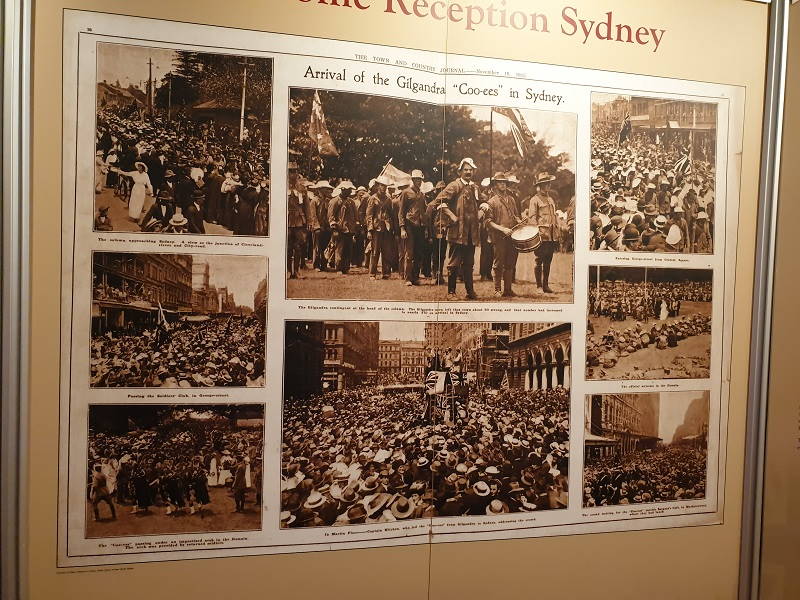 Другая часть посвящена первой мировой. Что интересно, кажется, что в Австралии первой мировой войне уделяется внимания больше, чем другим военным конфликтам. На этих стендах рассказывают о первом марше военного призыва 1915 года, когда по городкам Нового Южного Уэльса собирали добровольцев. Рекрутёры при этом издавали клич, на вроде “ку-ку”! По английски это звучит: “Coo-ees recruiting march”.